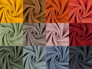 Paljon erilaisia vaatetuskankeita; vohvelineulosta, boubleface – paksu ja pehmoinen fleece, fitnes- ja rantalycra, joustava vakosametti, puuvillaneule, velour, vakosametti..