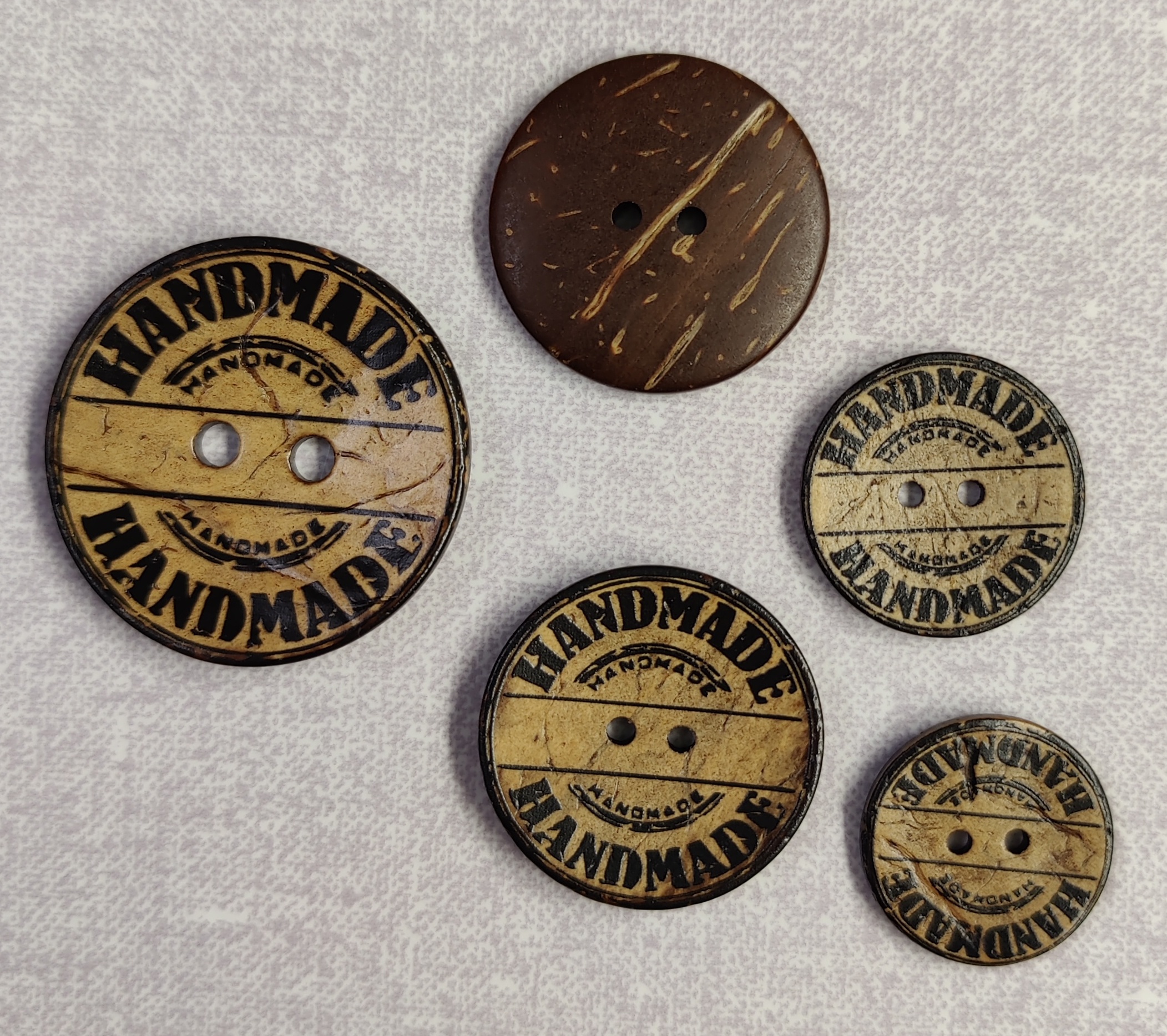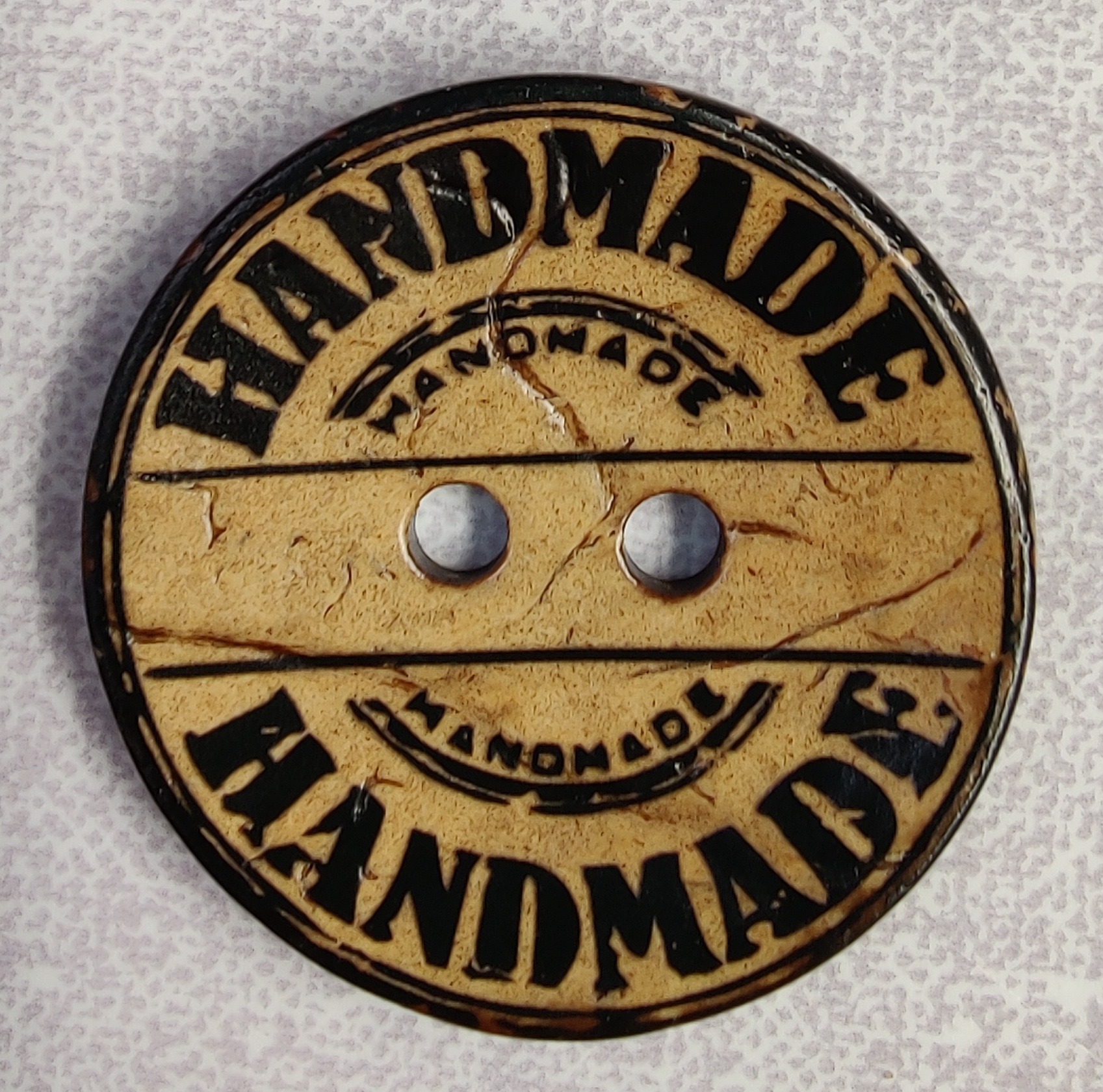 HANDMADE nappi johon painettu kuvan mukainen teksti.Kookospähkinästä valmistettu napin pinta näyttää hiukan nahkajäljitelmältä Kestää normaalin vesipesun