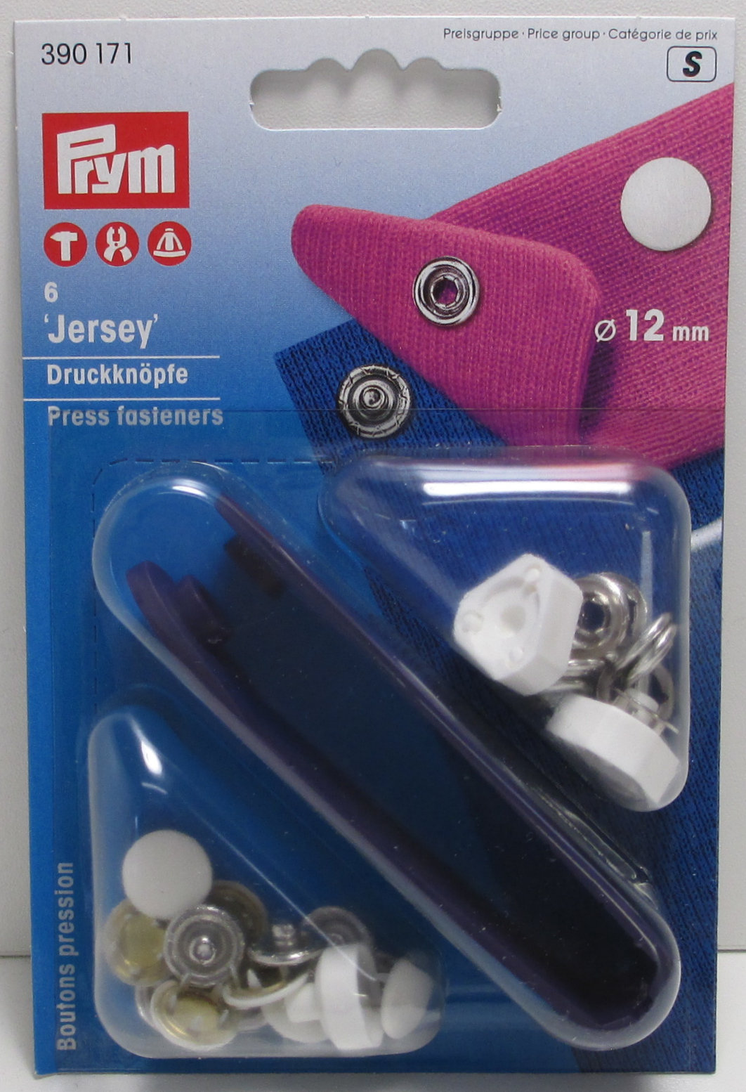 Jersey kansinepparit, koko 12mm, valkoinen, 6kpl/pkt, sisältää tarvittavat työkalut kiinnittämiseen. Prym390171