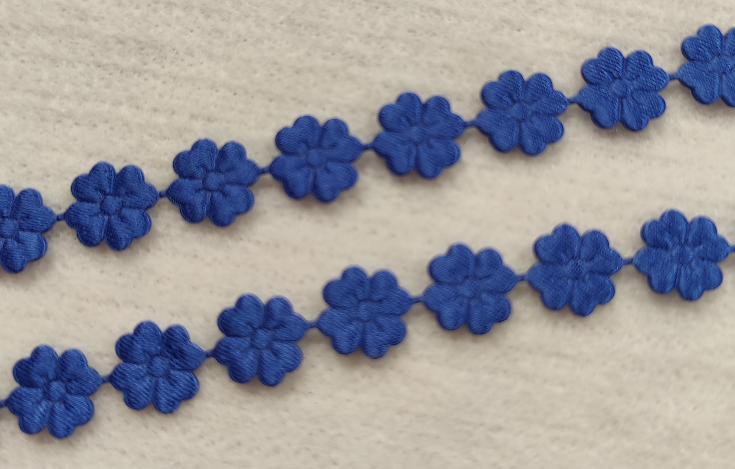 Sininen kukkanauha koristeeksi vaatteisiin, kodin tekstiileihin, erilaisiin pussukoihin, askarteluunKukkaset voidaan leikata erilleen ja käyttää vaikka korttiaskarteluunNauhan leveys 12mm