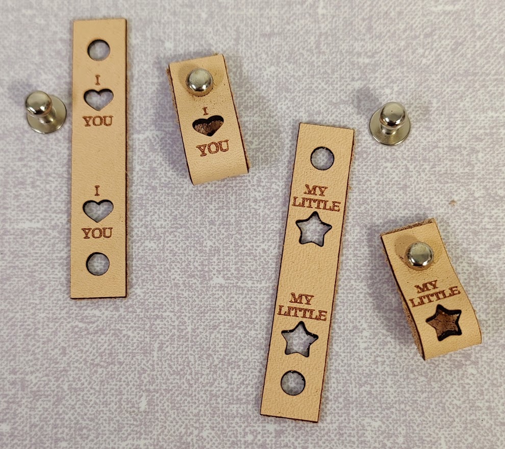 Nahkamerkki jossa on kiinnitysreikä ja metallinen tappi. Merkki voidaan helposti irrottaa vaatteesta pesun ajaksi tai tarvittaessa vaihtaa toiseen neuleeseen.