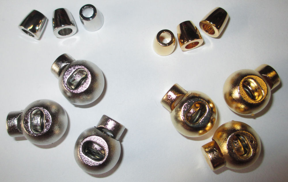 Nyörinpäät ja -stopparit hopean ja kullan värisenä.