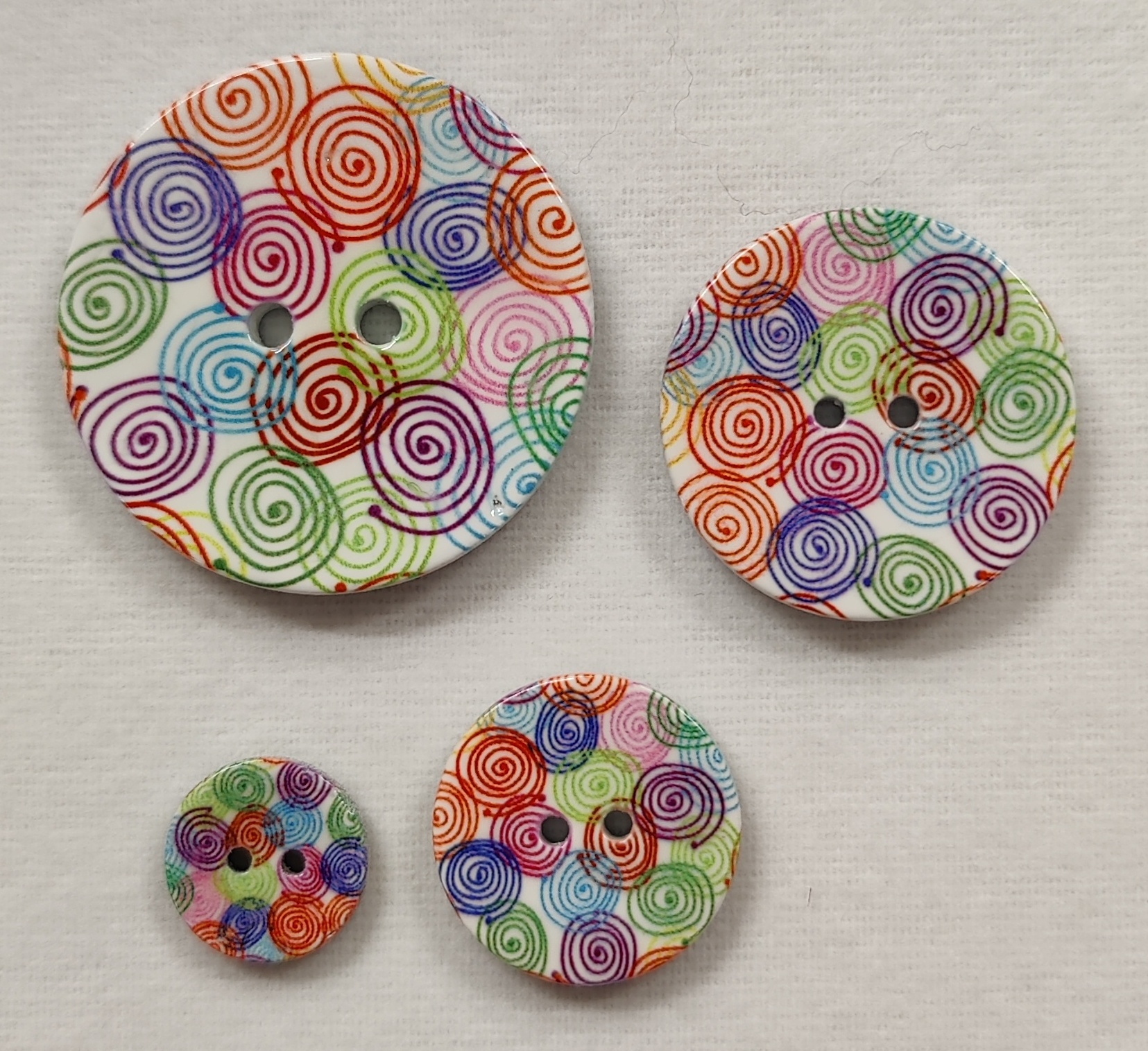 Värikäs ympyrä kuvioinen nappi.Kestää normaalin vesipesun, ei kuivausrumpua. Saatavilla neljä eri kokoa